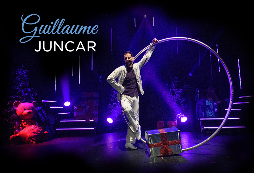 Guillaume Juncar est un acrobate d’exception, reconnu comme l’un des grands maîtres de la Roue Cyr. À travers cet anneau métallique, il déploie une écriture corporelle unique, mêlant équilibre extrême, puissance physique et sensualité du mouvement. Sa pratique transforme la Roue Cyr en un véritable partenaire de scène, donnant naissance à une performance à la fois hypnotique et poétique.